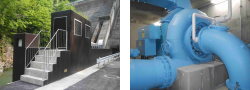 既設砂防ダムの水通し部に樋を設置して取水する方式は、我が国で初めての例になります。取水した水はFRPM管により発電所に導水し、横軸チューブラ水車で発電を行います。低圧配電線を利用して送電するという特徴もあります。